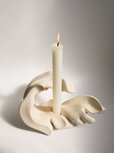 Decorative candlestick holder is made of natural stoneware clay, using traditional hand building techniques.